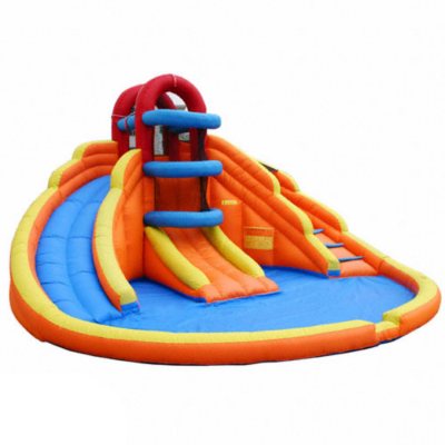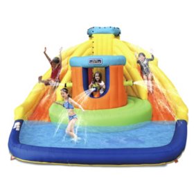 This inflatable water park features a safe and sturdy water slide, a built-in water slide sprayer for constant slippery fun and two giant sprinklers that are fun to duck under or jump over. Kids can also battle in a friendly basketball game in the large splash pool area which features a basketball hoop.
