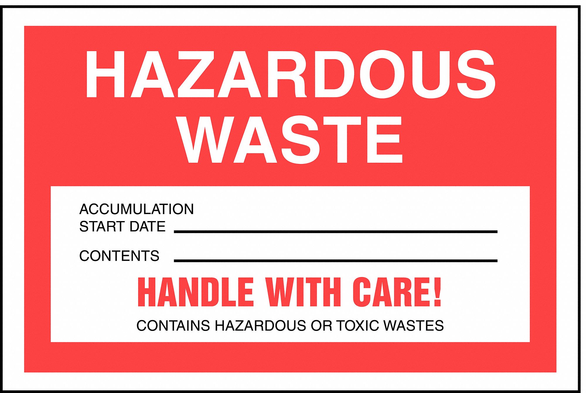 Labels and signage are the cornerstones of Hazard Communications. Body Protection Symbol;Eye Protection Symbol;Face Shield Symbol;Gloves Symbol;Human Head with Respirator;Human Head with Safety Glass, Chemical, Biohazard & Hazardous Material Signs & Labels, CLOSE CONTAINER WHEN NOT IN USE HAZARDOUS WASTE ACCUMULATION CONTAINER, Hazardous waste labels are designed to ensure your employees know the status of the contents they're working with by combining EPA and DOT requirements onto 1 label, Visibly mark your shipping and hazardous material information with pen or marker. Fax: (646) 962-0288, Toggle Labels, Lists & Signs menu options, Toggle We Offer Services For menu options. Compare Options {{product.totalChildProducts}}. All personnel should use the same method when filling out a hazardous waste label. Medical Surveillance and Injury Reporting, 10.1 Employees Working With Hazardous Substances, 10.3 Medical Examinations and Consultations, Chemical Inventory, Inspections, and Waste Login, Instruction Document: Reporting Accidental Loss on DEA Form 41, Instruction Document: Reporting Theft and Loss on DEA Form 106, When to Use Form 106 to Report a Theft or Loss, Using DEA Form 222 to Order Controlled Substances, New to Using Controlled Substances for Research and Teaching, Storing and Securing Controlled Substances, Batteries/Lamps/Electronic Waste Disposal, Chemical Waste Registry Searchable Database, Radioactive Incidents and Emergency Response, Disposing of and/or Decommissioning X-Ray Equipment, An accurate description of the waste (e.g., Halogenated Waste: Dichloromethane 60%, Chloroform 30%, Water 10%), The primary hazard(s) present in the waste (e.g., Poison, Flammable), The date that waste was initially added to a container (start date). JavaScript seem to be disabled in your browser. ), The proper shipping name and identification number of the hazardous material, The name and address of the shipper and/or the designated recipient.