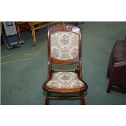 rocker folding tapestry upholstered nursing carved seat decoration floral These are utilitarian chairs, usually simple and made from pine. Leather, silk damask, and wool moreen were the main chair upholstery materials used. In good condition they sell for about $100 to $250 depending on the style. Ad from shop StreetsofLondon I guess I disagree with you somewhat. Beware of reproductions, this style became popular again in the 1980s.
