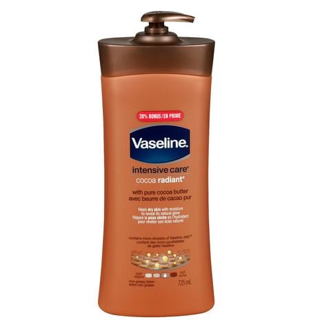Vaseline Vaseline Vaseline Intensive Care Cocoa Radiant Body Lotion moisturizes dry skin ; Vaselines Cocoa Radiant Body Lotion is made with 100% pure cocoa and shea butters, known to reveal skins natural radiance ; Heals dry skin for glowing radiance with non-greasy, rich moisturization ; Contains pure cocoa butter to moisturize dry skin and promote a natural glow